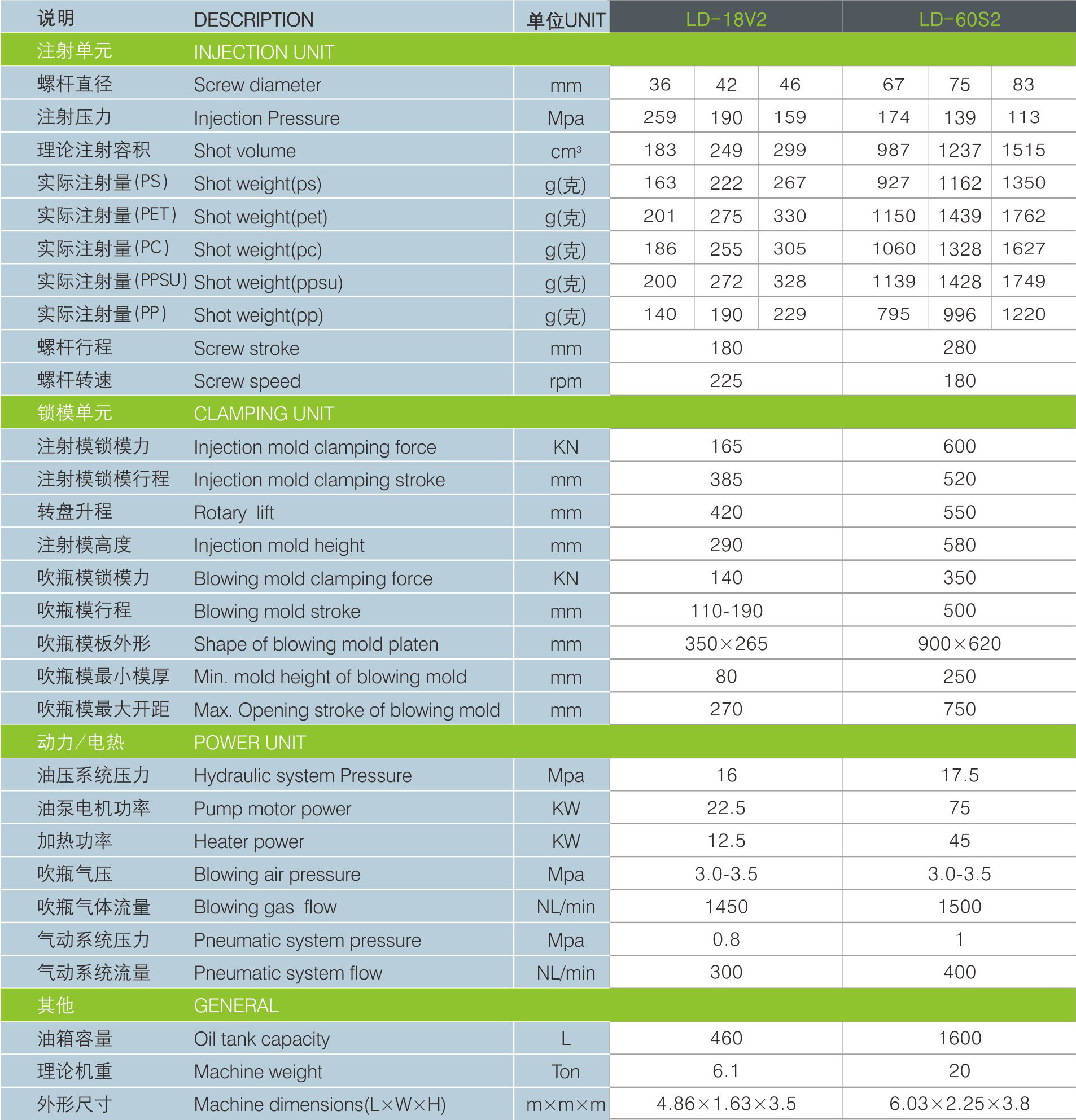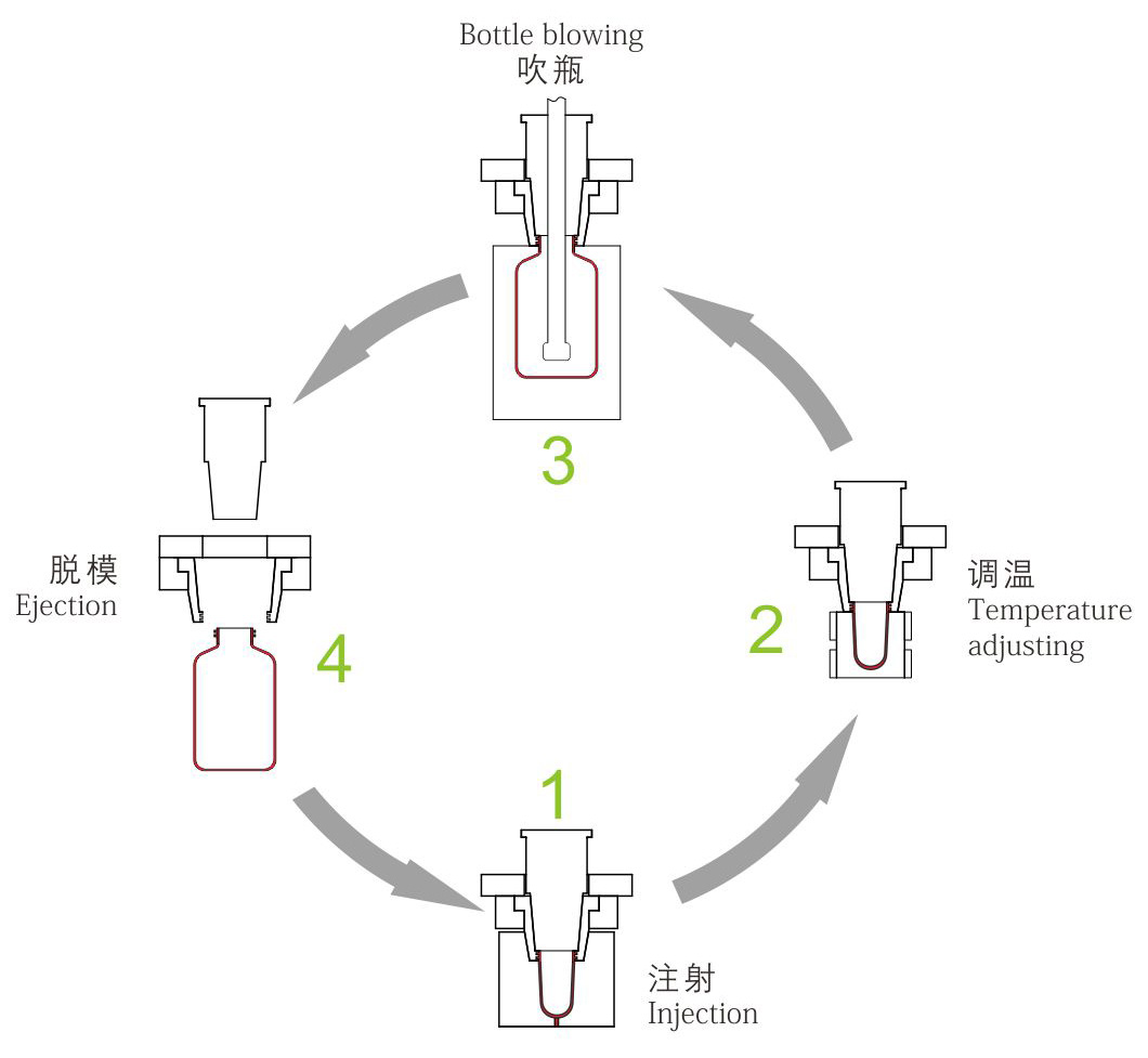 ·轉盤上均布注射、調溫、拉吹、脫模四個工位,同時進行注射成型、瓶胚調溫、拉吹成型、制品脫模四個工藝,實現(xiàn)一步法注拉吹成型。